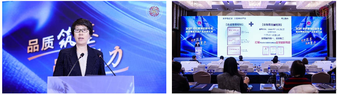 江苏新瑞贝生物科技股份有限公司市场总监张萍在《生物基化学品助力羽绒产业绿色可持续发展》的分享中提出,面对羽绒水洗领域性能与环保难以兼顾、异味根除难度大、绿色壁垒加剧等行业困局,企业要从全流程发力:在源头上,用生物基替代石油基,控制污染源头;在生产流程中,从原料到产品检测、认证、吊牌提供全过程绿色供应链支持,以“产品+工艺+检测”模式,推进水洗厂搭建绿色标准,降低碳排放。
